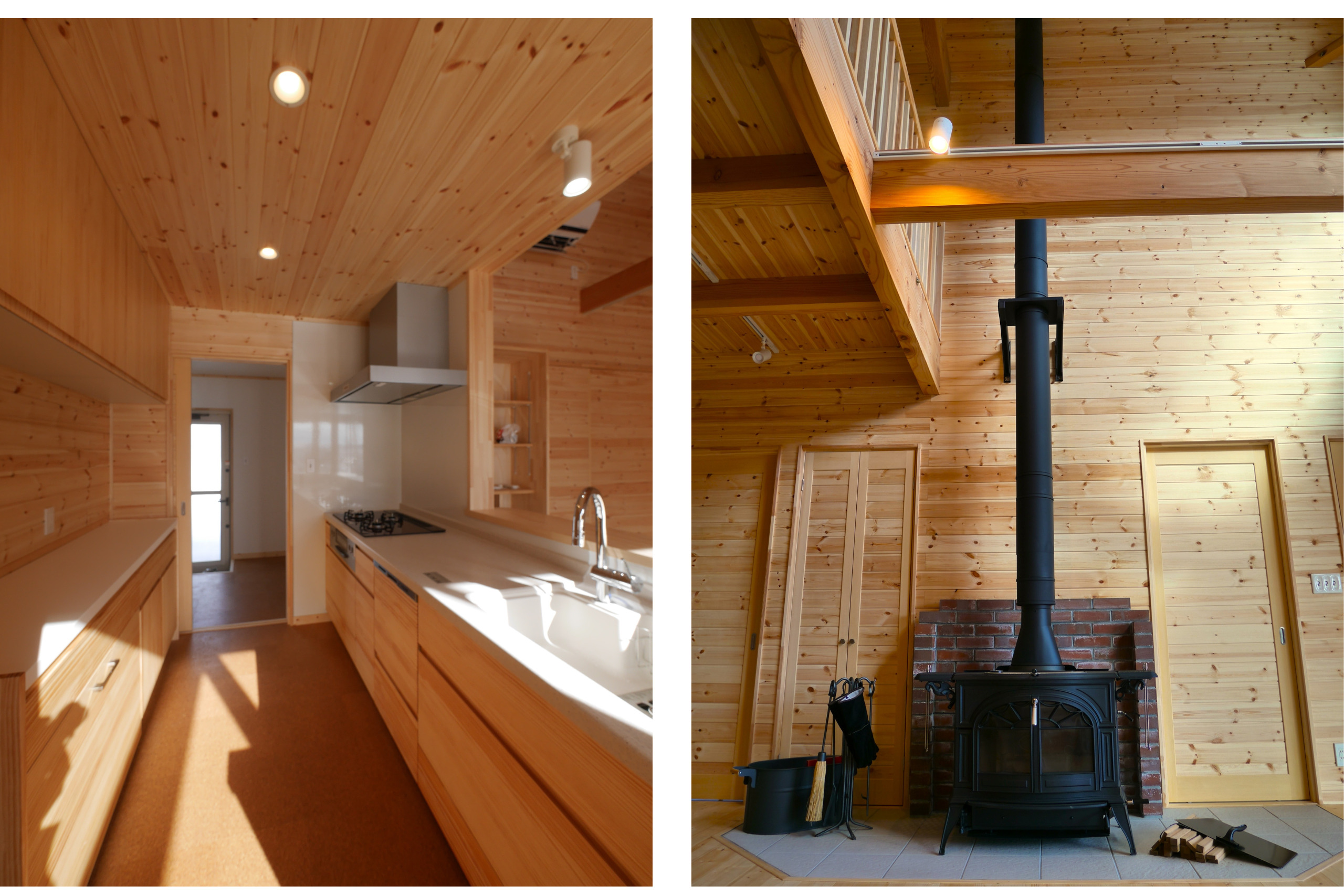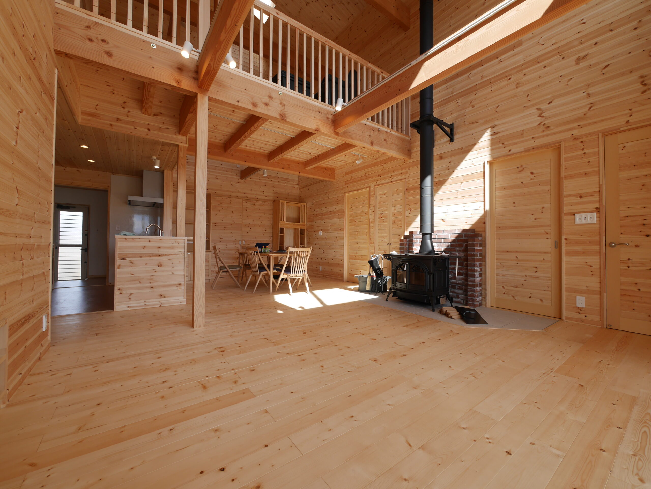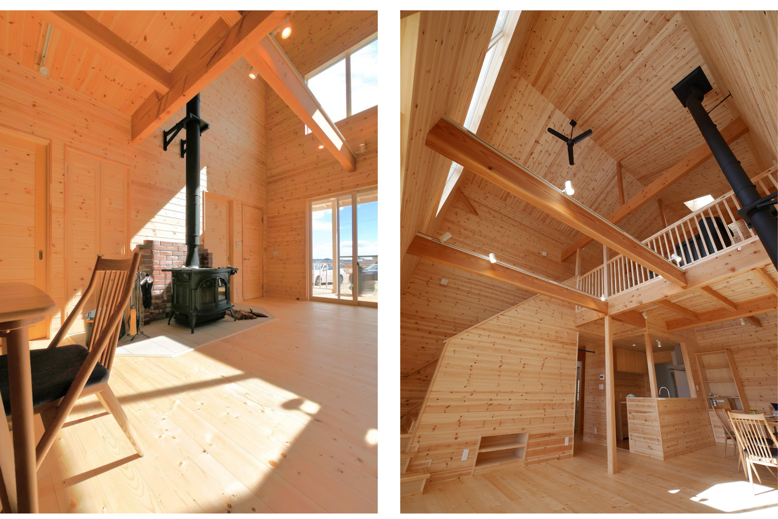 吹抜けとしたLDKからはたくさんの日差しが差し込み、夜には薪ストーブで家中を暖める設計。広々としたデッキは家の中と外をゆるやかに繋げます。